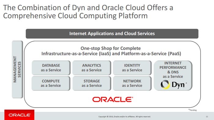 Oracle e Dyn rimarranno due realtà indipendenti fino al completamento della transazione. L’offerta dell’Isp, come mostrato nel grafico pubblicato qui sopra, si affiancherà alle soluzioni cloud infrastrutturali e di tipo Platform-as-a-Service (PaaS) che il gigante fondato da Larry Elison mette a disposizione. Dyn porterà quindi in dote componenti di monitoraggio delle performance delle applicazioni Internet e di Dns. Tutto as-a-Service.