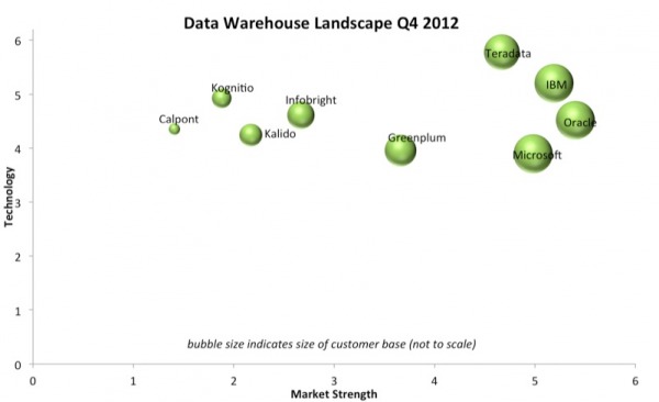 miglior vendor (dell'ultimo trimestre 2012), in base all’intersezione di quattro parametri: la soddisfazione dei clienti, le impressioni degli analisti sulla tecnologia, la maturità della tecnologia e la sua ampiezza confrontata con il modello funzionale di The Information Difference. In particolare, sulla base di un sondaggio effettuato tra i clienti di riferimento, quelli di Teradata sono risultati i più soddisfatti in assoluto.