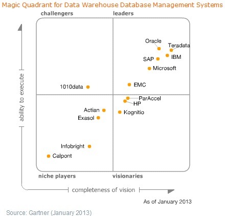 Oracle, che è leader di mercato per i Data Warehouse Database Management System con il 49% del giro d’affari di questo segmento. Ibm, Sap, Microsoft e (poco al di sotto) Emc rientrano nel medesimo quadrante: tutte possono vantare alti punteggi nelle valutazioni di Gartner sui due assi del grafico, cioè la completezza di visione, da un lato, e la validità, capacità e maturità del prodotto dall’altra.