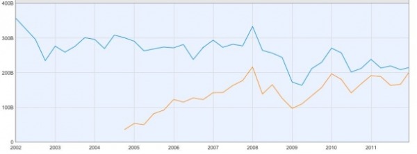 Appare evidente che non sarà difficile per Google fare gli ultimi passi verso la vetta, considerato che il suo valore è in crescita costante dal 2004, mentre quello di Microsoft sta seguendo un andamento altalenante che nel complesso è discendente.