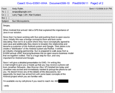 Per quanto riguarda Sun, a screditare Google e metterla in grande difficoltà nel processo contro Oracle sono una serie di mail scambiate fra Andy Rubin, Larry Page e Sergey Brin, in cui sono dettagliatamente descritti i termini del possibile accordo con Sun per le licenze Java, poi sfumato. Le due opzioni che sono state prese in considerazione ai tempi sono state il pagamento delle royalties e la licenza open source.