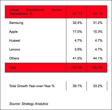 Intanto la società statunitense di ricerche Strategy Analytics ha divulgato le sue stime per il mercato degli smartphone. Nel primo trimestre del 2014 le vendite sono aumentate del 33 per cento, raggiungendo i 285 milioni di pezzi. In questo contesto, Samsung ha venduto 89 milioni di unità, conquistando una quota di mercato del 31 per cento. Un anno era il 32 per cento, ed è la prima volta dal 2009 che l’azienda coreana registra un segno meno davanti alla sua fetta. Apple, per altro, è cresciuta nello stesso periodo solamente del 17 per cento, con 43,7 milioni di iPhone venduti, scendendo dal 17 al 15 per cento del mercato.