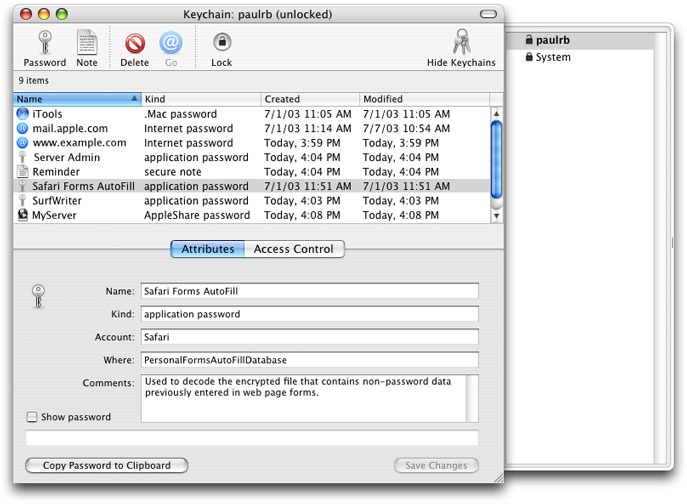 Una schermata di esempio di Keychain